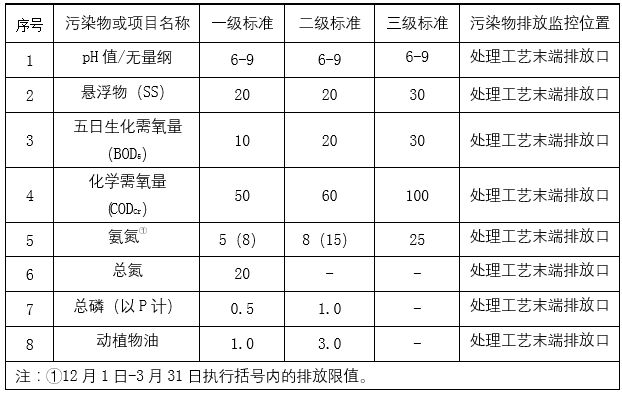 ◆ 出水排入其它水體的處理設施執行二級標準。其中,規模在500m3/d(不含)- 50m3/d(含)的處理設施執行A標準,規模在50m3/d(不含)-5m3/d(含)的處理設施執行B標準。
