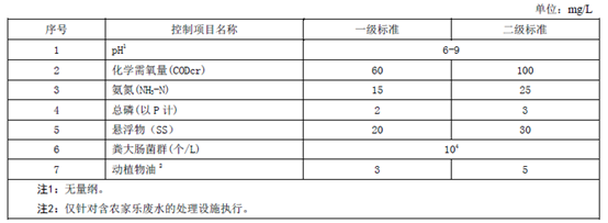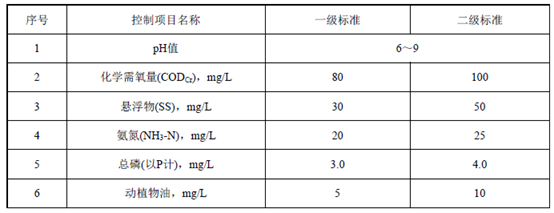 ◆ 根據受納水體的水域功能與排放規模等,將農村生活污水集中處理后水污染物排放標準值分為一級標準、二級標準,各標準適用情況及水污染物最高允許排放濃度限值見下表。