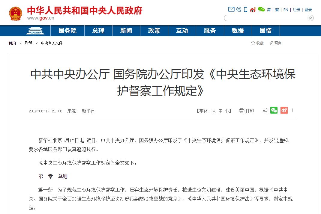 近日,中共中央辦公廳、國務院辦公廳印發了《中央生態環境保護督察工作規定》,并發出通知,要求各地區各部門認真遵照執行。全文如下: