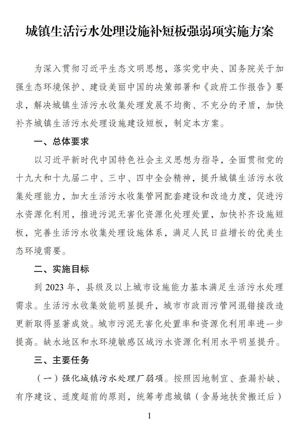 近日,為貫徹落實黨中央、國務院決策部署和《政府工作報告》要求,加快補齊城鎮生活污水處理短板弱項,推進新型城鎮化建設,國家發展改革委、住房城鄉建設部研究制定了《城鎮生活污水處理設施補短板強弱項實施方案》(以下簡稱《方案》)。