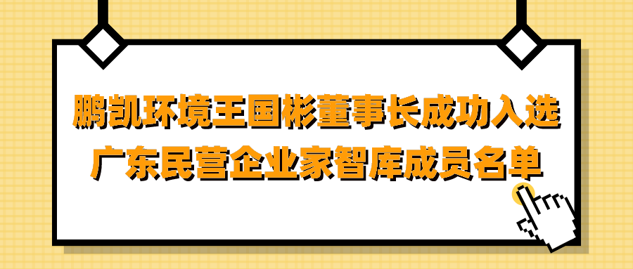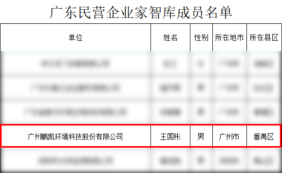 5月12日,廣東省工業和信息化廳發布《廣東省工業和信息化廳關于廣東民營企業家智庫成員名單的公示》,廣州鵬凱環境科技股份有限公司董事長王國彬成功入選廣東民營企業家智庫成員名單。