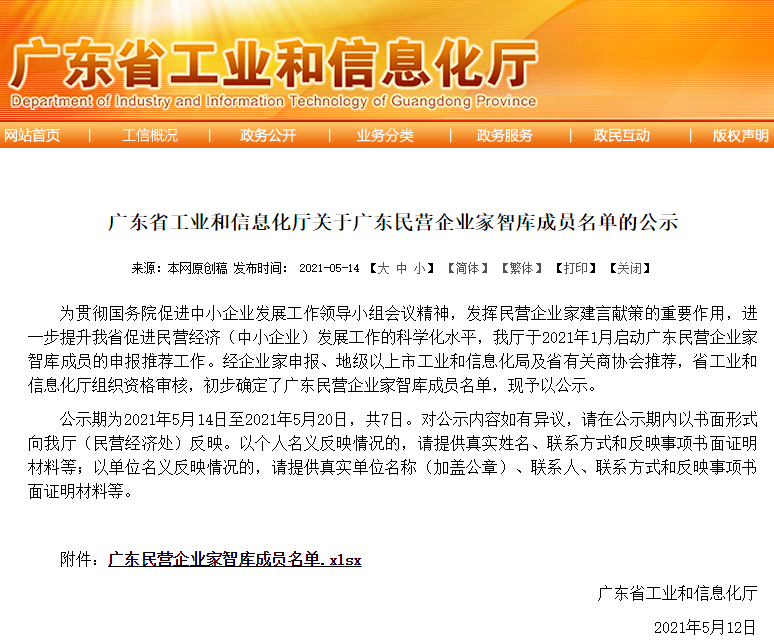 《廣東省工業和信息化廳關于廣東民營企業家智庫成員名單的公示》