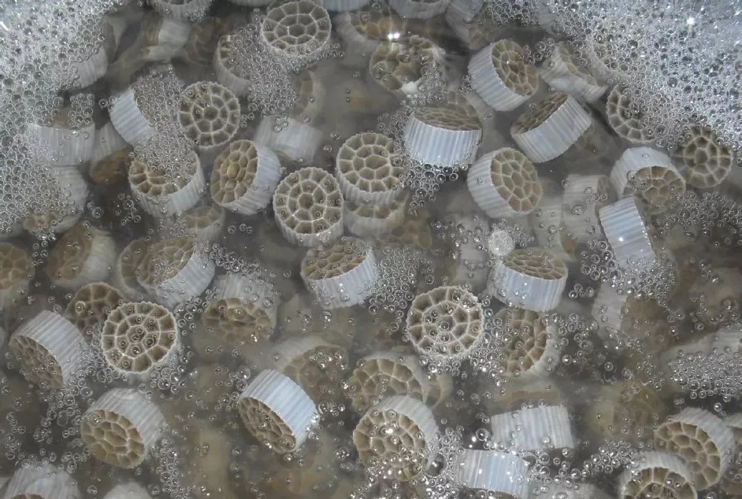 載體在水中的碰撞和剪切作用,使空氣氣泡更加細小,增加了氧氣的利用率。另外,每個載體內外均具有不同的生物種類,內部生長一些厭氧菌或兼氧菌,外部為好氧菌,這樣每個載體都為一個微型反應器,使硝化反應和反硝化反應同時存在,從而提高了處理效果。