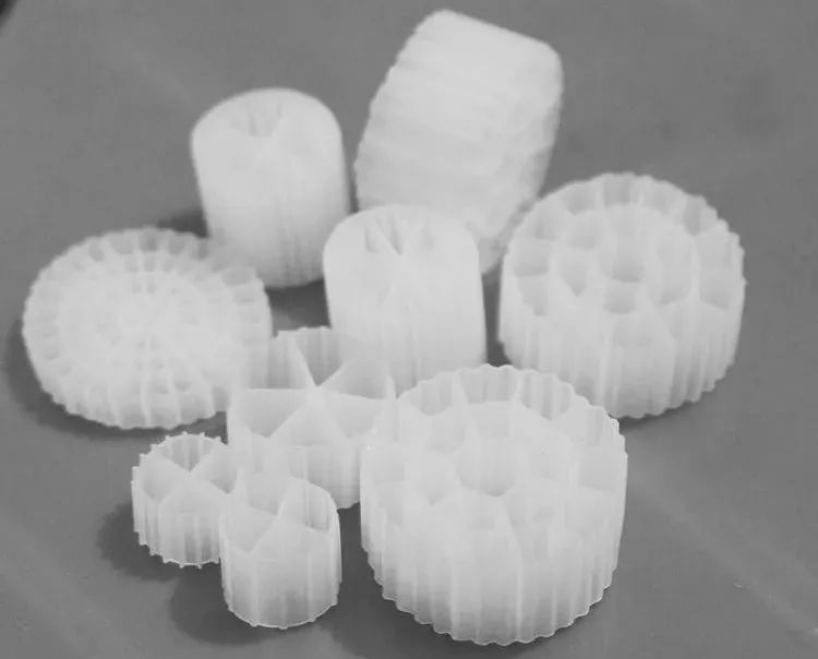 此類型的生物填料有利于微生物在填料內側附著生長,形成較穩定的生物膜,并且容易形成流化狀態。當預處理要求較低或污水中含有大量纖維物質時,例如在市政污水處理中不采用初沉池或者在處理含有大量纖維的造紙廢水時,采用比表面積較小、尺寸較大的生物填料,當已有較好的預處理或用于硝化時,采用比表面積大的生物填料。