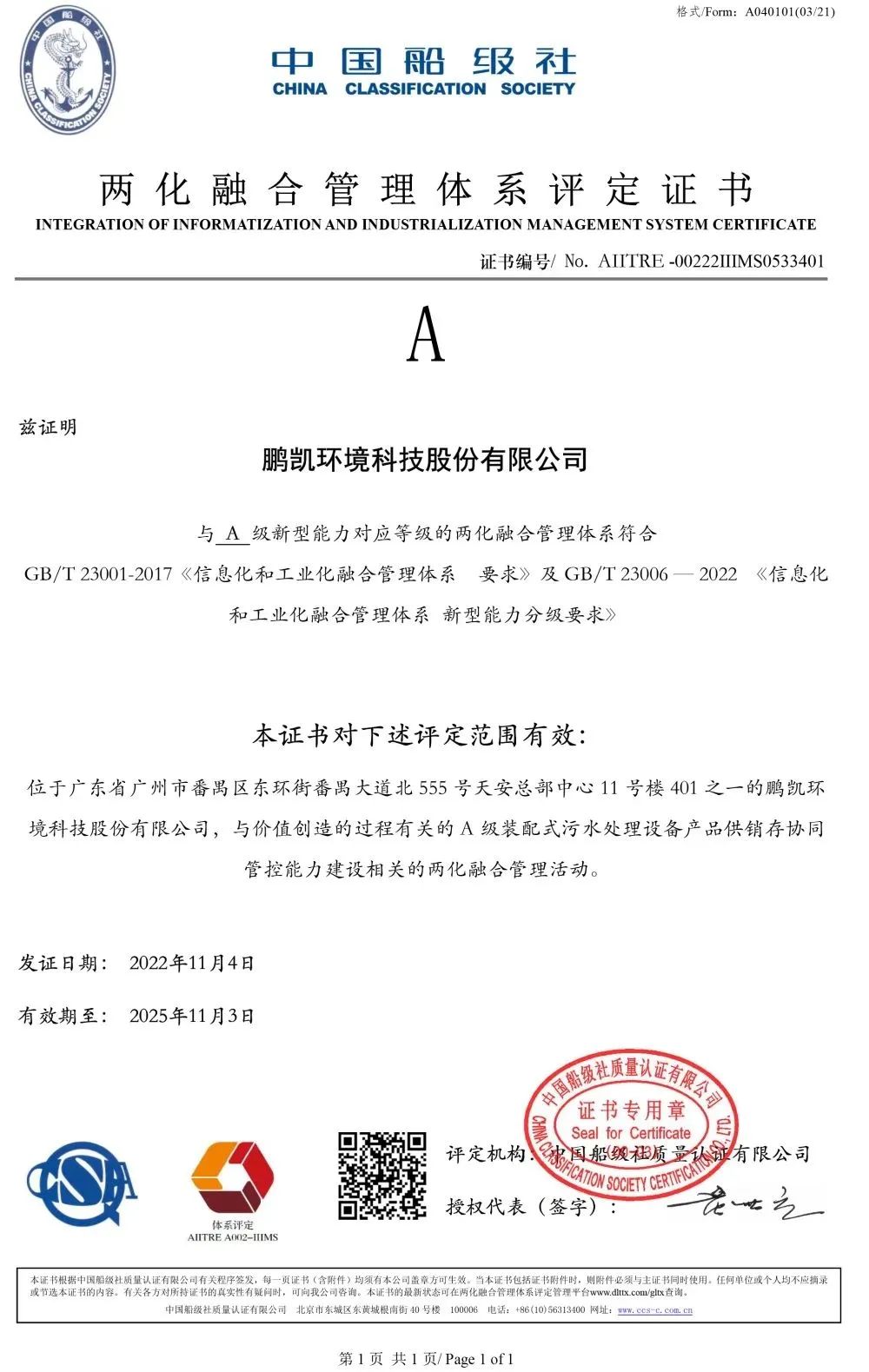 走新型工業(yè)化道路——鵬凱環(huán)境喜獲《兩化融合管理體系評定證書》