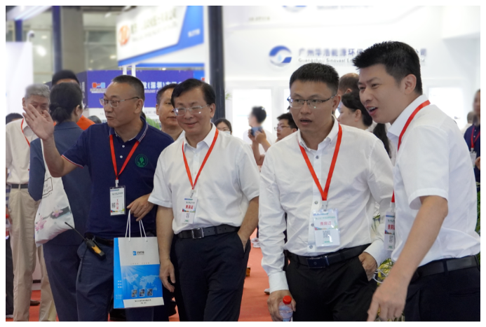 廣州市生態環境局黨組書記、局長楊柳,廣州市生態環境局副局長林少敏,廣東省生態環境廳科技處二級調研員周雪峰,廣州環境保護產業協會會長戴自覺,中國生態文明研究與促進會副秘書長于緒文,廣州環衛行業協會常務副會長葉泗開,廣東省城市垃圾處理行業協會會長邱劍濤,廣東省市政行業協會常務副會長唐建新,香港生產力促進局都永海,廣東省環保研究總院院長劉榮華,廣東省城鎮供水協會秘書長潘景盛等領導出席博覽會并為開幕式剪彩。鵬凱環境董事長王國彬受邀參加此次開幕式,與領導嘉賓共同見證本次盛會的開啟。