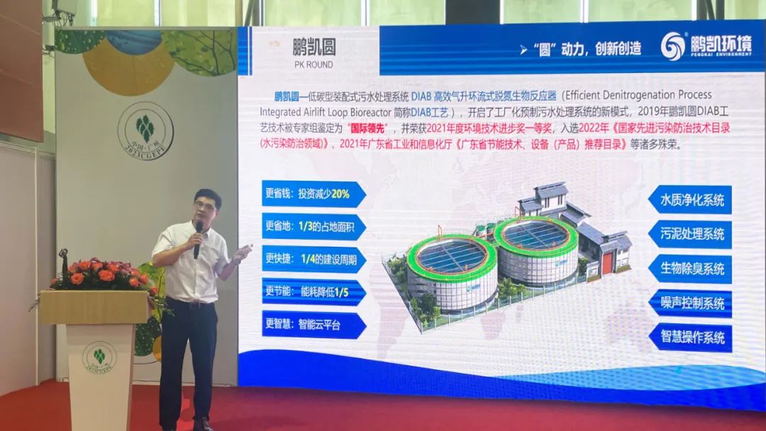 同期舉辦的土壤、水污染與生態修復論壇上,鵬凱環境朱梟強博士作《低碳型裝配式污水處理系統探索與實踐》主題報告,向與會觀眾詳細介紹鵬凱圓-裝配式污水處理系統的核心技術和成功應用案例。