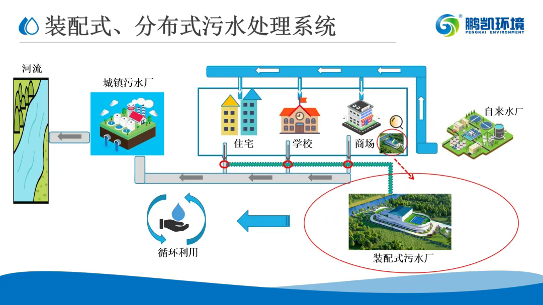 城市水生態微循環系統是對綠色低碳發展戰略的深刻回應,其秉持“五水統籌”核心理念,通過城市網格化劃分,在各區塊內部署小型裝配式污水廠進行凈化處理,并實現資源化回用,將回用水高效整合應用于生活用水、工業生產及生態補水等多種場景,構建了“統一用水、就地收集、就地處理、就地回用”的資源化生態循環模式。這一模式不僅大幅減少了市政管網及中途泵站的巨額建設和維護成本,還從根本上解決了雨季冒溢、旱季溢流等民生難題,有力保障民眾生活質量,擦亮高質量發展的溫暖底色。