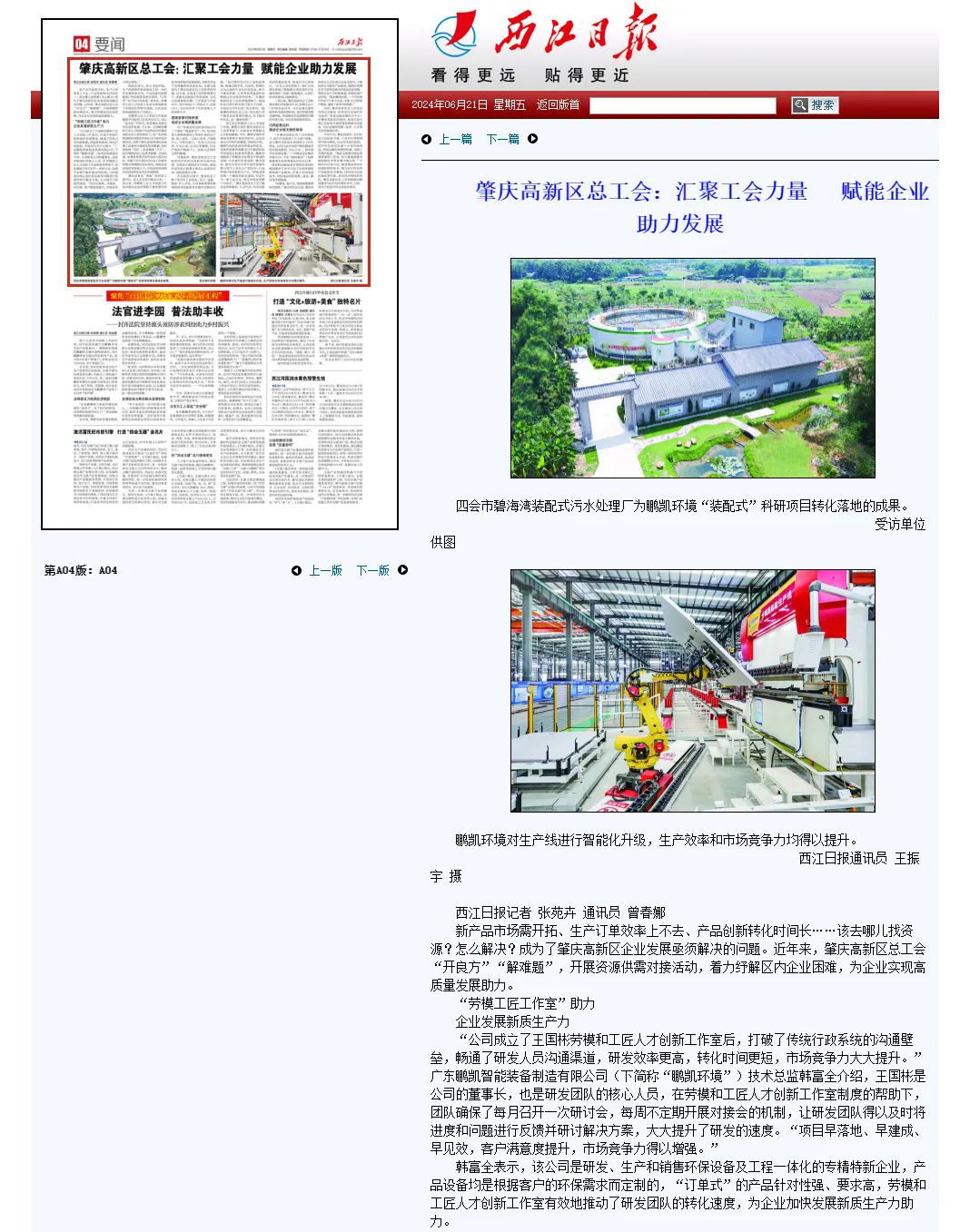 在《肇慶高新區(qū)總工會:匯聚工會力量 賦能企業(yè)助力發(fā)展》一文中,西江日報對鵬凱環(huán)境的創(chuàng)新實踐與成就給予了詳盡的報道,詳細(xì)內(nèi)容如下: