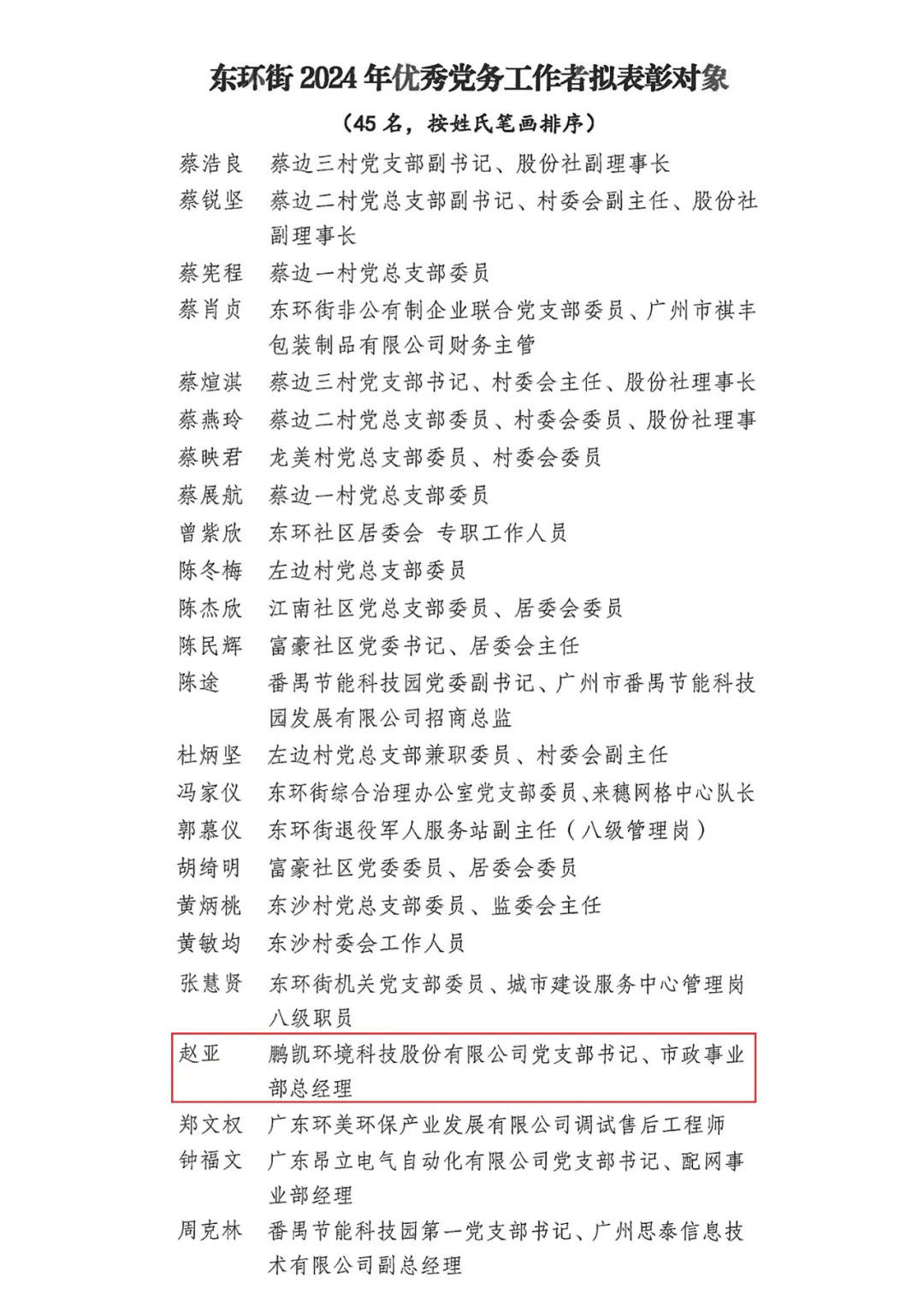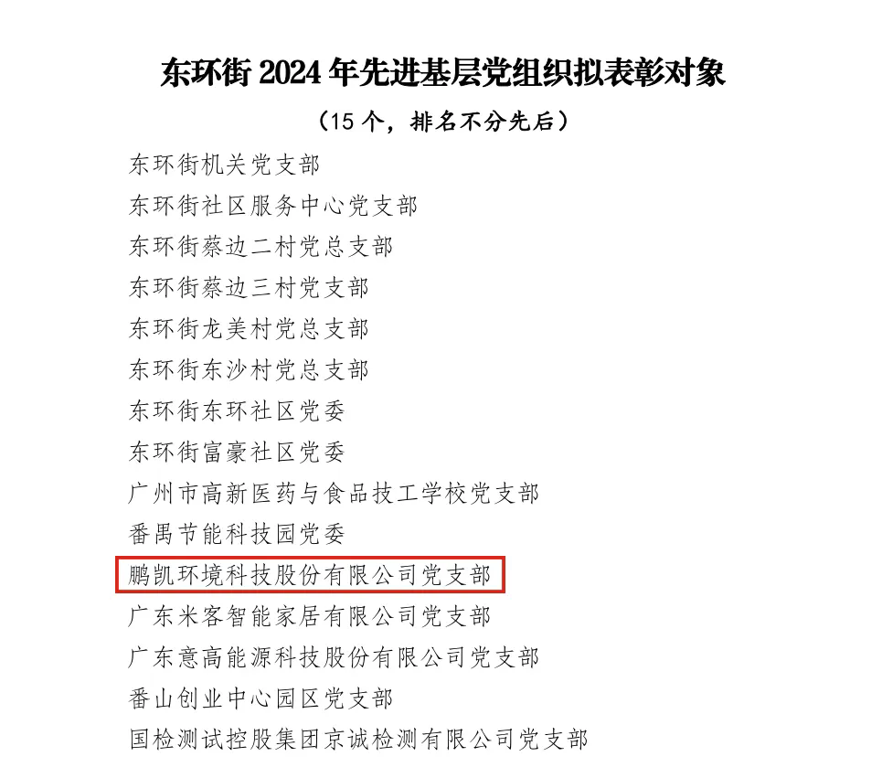 一、 中共鵬凱環境科技股份有限公司支部委員會被評為廣州市番禺區東環街先進基層黨組織。趙亞同志榮獲東環街 2024 年“兩優一先”優秀黨務工作者稱號,劉婷婷同志獲得東環街 2024 年“兩優一先”優秀共產黨員稱號。