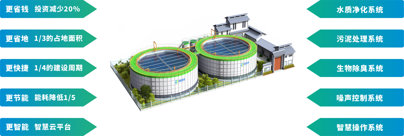 鵬凱圓-低碳高效裝配式污水廠以“工程設(shè)備化、設(shè)備標(biāo)準(zhǔn)化、運(yùn)維智能化”為核心設(shè)計(jì)理念,開啟了工廠化預(yù)制污水處理系統(tǒng)的新模式,較傳統(tǒng)污水廠具有“2345”綜合優(yōu)勢(shì):投資成本減少20%;占地面積僅為傳統(tǒng)污水廠的1/3;建設(shè)時(shí)間僅需傳統(tǒng)污水廠的1/4;能耗降低1/5。