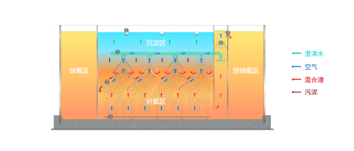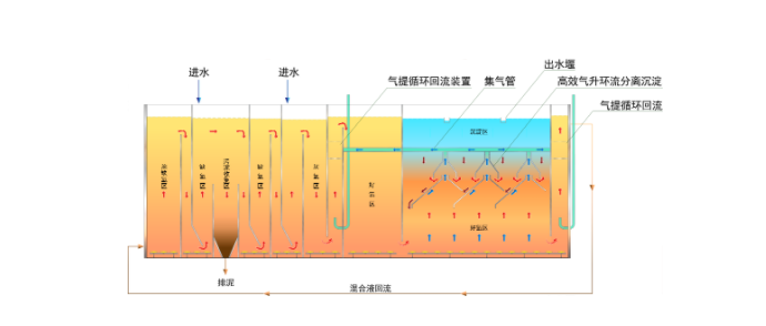 1. 通過(guò)水力作用讓厭、缺氧段的生化污泥處于流化懸浮狀態(tài),提高泥水的充分接觸效率;